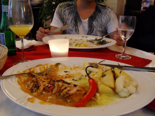 Er hatte Tintenfisch bestellt und ich gebratenes Hühnerfilet. ( Und eine Tomatensuppe die viel zu scharf war. WO ich die CHILLISCHOTEN gesehen habe in der Suppe, dachte ich mir: Jetzt zeig ich es Dang und zeige ihm , das ich nicht nur süßes vertragen kann!! Aber Falsch von mir!!! Denn es brannte so im Hals, das ich fast Feuer gespuckt hätte ... :( ..... )